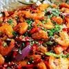 10、 将事先炸 过的干辣椒放入一起炒。加入糖、盐(视情况,豆瓣、火锅调料里都有盐)、鸡精(依各人口味)调味,炒匀即可,用大碗盛出洒上芝麻和香菜即可。