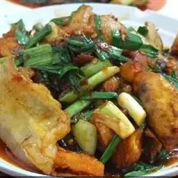 4.然后,倒大概1/3瓶或者半瓶啤酒,盖上盖子焖。 焖到汤汁基本收干。5,加上葱花、加热油淋上,如需更麻辣,就加麻辣酱炒好。