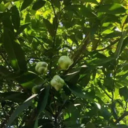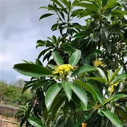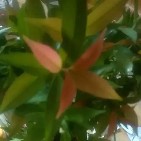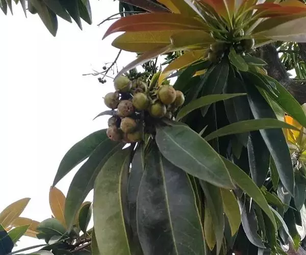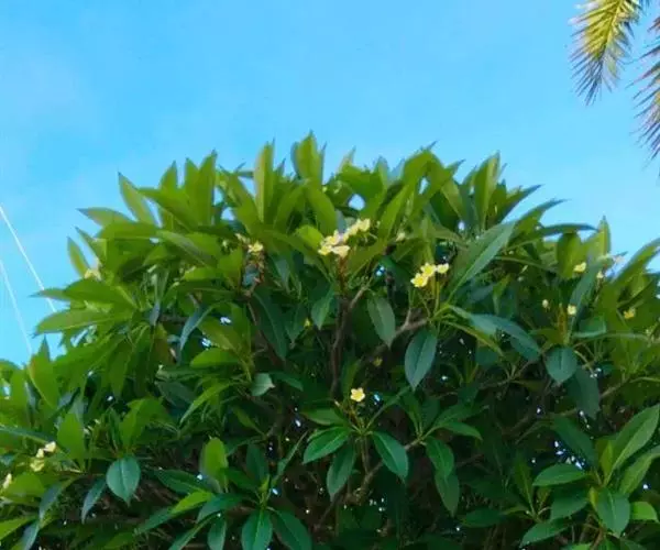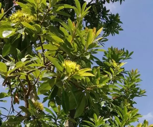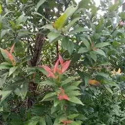 常绿乔木,株形挺拔,主干明显,6年生植株树高可达5米。叶色亮绿,叶对生、互生或丛生枝项,披针形,全缘,革质,叶表光滑,新叶带有红色,揉搓有番石榴气味。