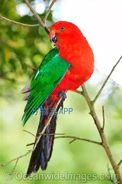 澳洲国王鹦鹉体长41-43厘米,体重275克,寿命25年。有2个亚种,亚种主要差异在于体型大小,羽色上则几近相同,它们的个性相当友善,羽色非常鲜艳美丽。成鸟雌雄差别显著。