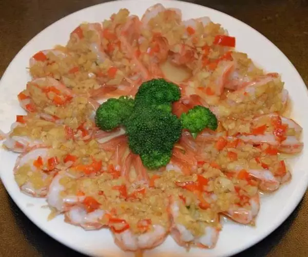 2、将虾放入碗内,加盐、胡椒粉、蒜茸、粉丝腌好,入笼蒸熟。