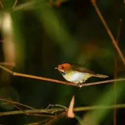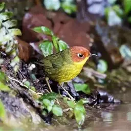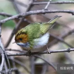 棕脸鹟莺:体长10厘米,是一种色彩亮丽而有特色的莺鸟。头栗色,具黑色侧冠纹。上体绿,腰黄色。下体白,…
