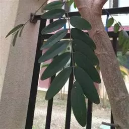 托叶早落。叶长10-20厘米,无毛,有小叶4-5对;小叶革质,无毛,卵形、长卵形或椭圆状披针形,长6-12厘米,宽3.5-6厘米,两侧不对称,上侧较狭,下侧较阔,顶端渐尖或短渐尖,基部圆形或阔楔形,边全缘;小叶柄长约,毫米。