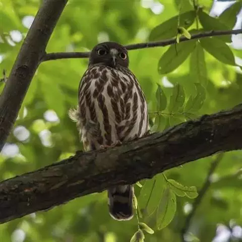 鸺鶹(Glaucidium cuculoides)是我国南方普遍分布的一种小型鸮类,它的整个上体以棕褐色为主,密布有狭细的棕白色横斑;翅及尾羽黑褐色,在尾羽上有六条鲜明的白色横带,头部不具耳羽,这些特征使它很容易与红角鸮区别开来。鸺鶹是昼夜活动,因而白天在林中也很容易遇到它,为我国南方留鸟。主要以昆虫为食,也吃鼠类及青蛙等。
