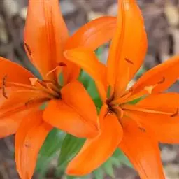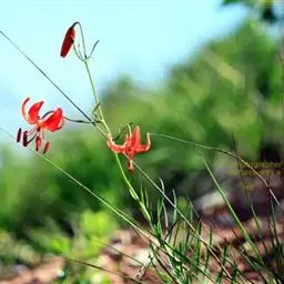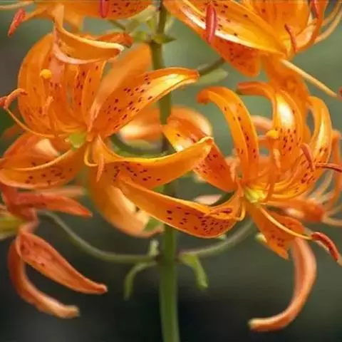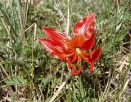 兰州百合花:花为总状花序。花色橙红,下垂。花被6片,广披针形,内面中部有多数粒状突起,排列成内外两层,互相错开。外层三片宽1.6-1.8厘米,长约6厘米,内层三片宽2.2-2.4厘米,长约18厘米。花开放后向外反卷。