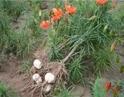 栽种倒沟母籽:百合种植3年后开挖,筛选出烂苗、死苗、不长苗及病菌苗等问题苗,将其淘汰。剩余的健壮苗简称为倒沟母籽,将其选出后再栽种下去。这样种植下去的都是已经长了3年,且各方面都没有大问题的母籽,会大大提高百合再长3年后的产量和品质。