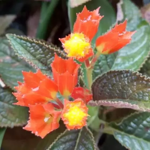 花单生于叶腋,长约2~3㎝,5个萼片,花冠呈唇形,下部膨大,先端5小裂,橙红色,裂片黄色,裂片间红色;雄蕊着生于花瓣上,花药粘连;雌蕊一枚。蒴果,与玄参科植物相似。