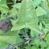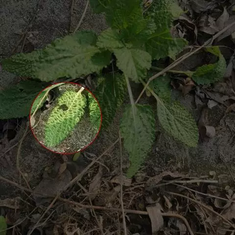 叶有基生叶和茎生叶,茎生叶较少,几全部为基生叶,均具长柄,叶片长圆状戟形或卵状心形,长3.5-9.5厘米,宽2-5.3厘米,先端钝,基部心形或近戟形,边缘有不整齐的圆齿,纸质,两面被微硬伏毛,下面更多,密被深紫色腺点;叶柄长3-17厘米,在下部的最长,向上渐短,被微硬伏毛。