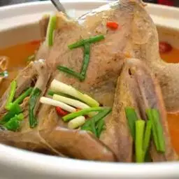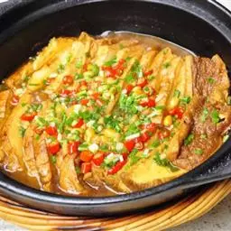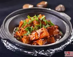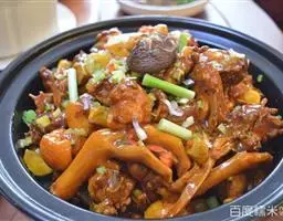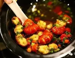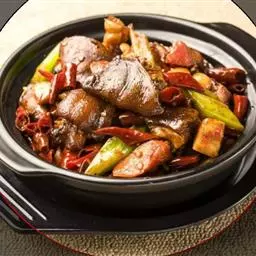 4、热锅凉油,放入少量干辣椒段、麻椒,然后放入蒜片、姜煸香,加辣酱、高汤,倒肉蟹、鸡爪翻炒收汁,装入煲盘撒香葱段即可。