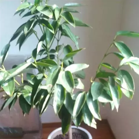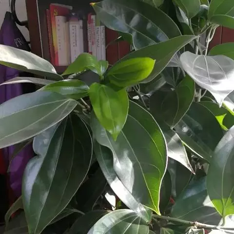 2、阴香。常绿乔木,高达20m。小枝赤褐色,无毛。叶近于对生或散生,革质,卵形或长椭圆形,长6-10cm,宽2-4cm,先端短渐尖,基部楔形至近圆形,全缘;上面绿色,有光泽,下面粉绿色,两面均无毛,具离基3出脉,脉腋内无隆起的腺体;叶柄长8-12mm。圆锥花序顶生或腋生;花小,绿白色,花被6,基部略合生,长4-5mm,两面均被柔毛;能育雄蕊9,排成3轮,外面2轮花药内向,第3轮花药外向,花药均为卵形,4室,瓣裂,花丝短,最内尚有1轮退化雄蕊;雌蕊1,子房上位,1室,1胚珠,花柱细,柱头小。浆果核果状,卵形,长不及1cm,直径约5mm,基部具肥厚杯状的宿存花被,其先端具6截形短裂片。花期3-4月。果期4-10月。