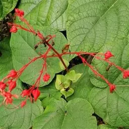红萼龙吐珠(学名:Clerodendrum speciosum)马鞭草科大青属常绿木质藤本。叶对生,纸质,具柄,卵状椭圆形,全缘,先端渐尖,基部近圆形。聚伞花序腋生或顶生,花冠红色,花萼红色,雌雄蕊细长,突出花冠外。核果。花期春至秋末。