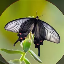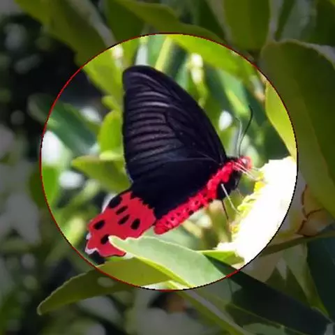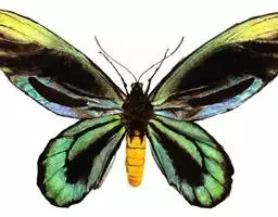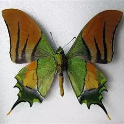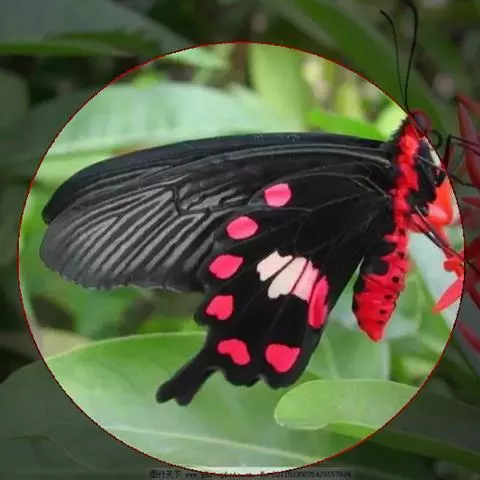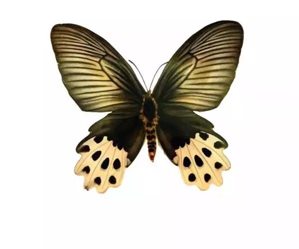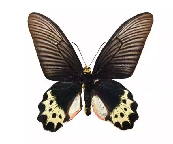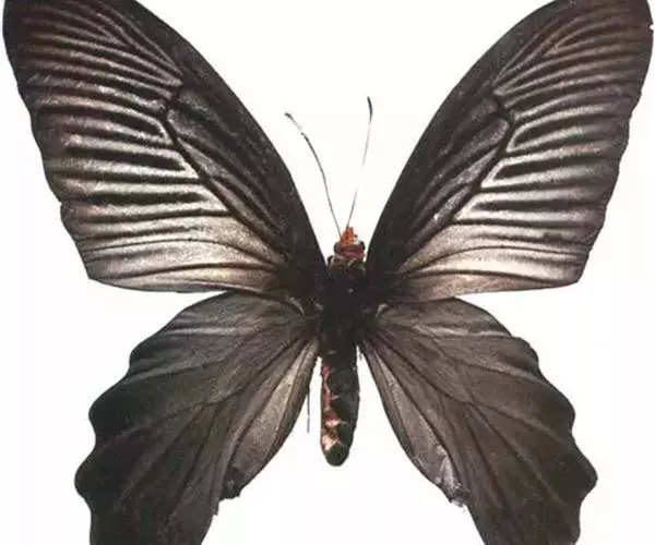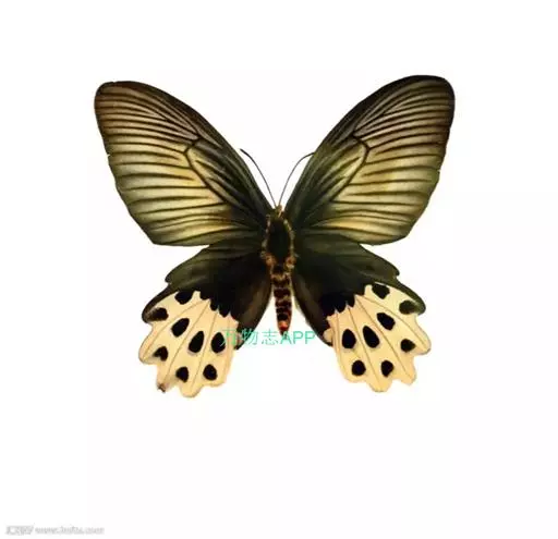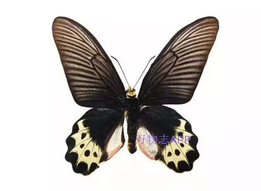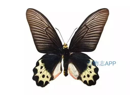 成虫:翅展115 mm左右。体背黑色,两侧红色。翅黑褐色,脉纹两侧灰色;雄蝶后翅狭窄,亚外缘有3个齿状白斑,外缘波状。雌蝶翅较阔,后翅亚外缘的白斑发达,阔而数目增加,扩展到前缘及内缘,有时这些大白斑中心有黑圆斑。翅反面色淡,白斑扩大、色淡,近前缘另有1个小白斑;其余与正面相似。雄性外生殖器上钩突上下等宽,骨化程度强;尾突长而具毛,中间膜质相连。抱器瓣宽大于长,抱器端稍窄,两侧有2个角突是抱器腹和抱器背的延伸形成的;抱器腹弧形,内突形成2个大角突。囊形突长半圆形。阳茎极粗。雌性外生殖器产卵瓣半圆形,具少数强刺;交配孔宽大,中间有舌形骨化的突起;前阴片强度骨化,两侧略呈刀片状,中部呈双马蹄形。囊导管宽短,膜质;交配囊大;囊突很长,几乎与交配囊等长,两端细柄状,中后部宽,由小突起构成有规律的褶痕。寄主 马兜铃科Aristolochiaceae的植物。
