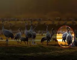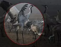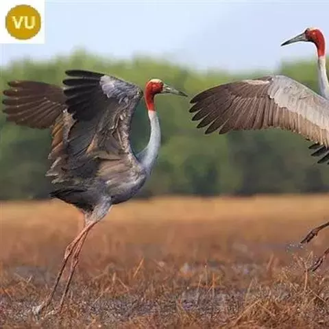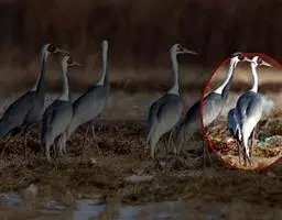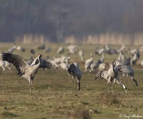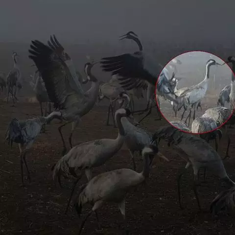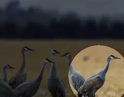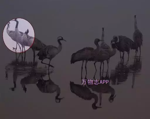 灰鹤 灰鹤成5-10余只的小群活动,迁徒期间有时集群多达40-50只,在冬天越冬地集群个体多达数百只。性机警,胆小怕人。活动和觅食时常有一只鹤担任警戒任务,不时的伸颈注视四周动静,发现有危险,立刻长鸣一声,并振翅飞翔,其他鹤亦立刻齐声长鸣,振翅而飞。飞行时排列成‘V’字或‘人’字形,头、颈向前伸直,脚向后直伸。栖息时常一只脚站立,另只脚收于腹部。