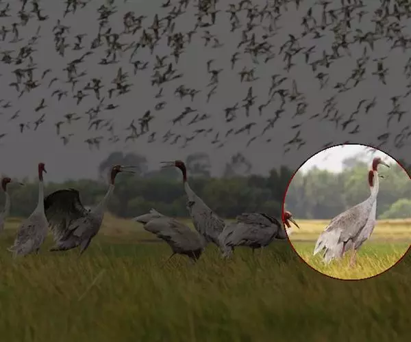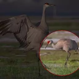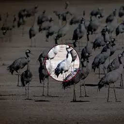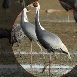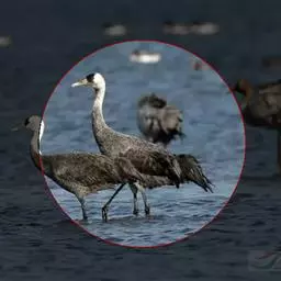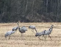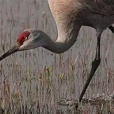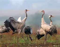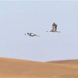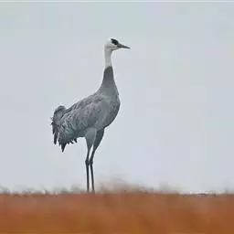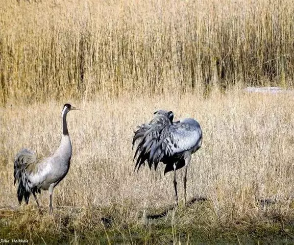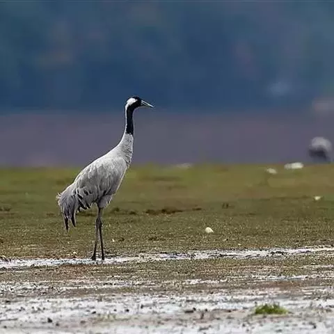 灰鹤(学名:Grus grus)是大型涉禽,体长100-120厘米。颈、脚均甚长,全身羽毛大都灰色,头顶裸出皮肤鲜红色,眼后至颈侧有一灰白色纵带,脚黑色。栖息于开阔平原、草地、沼泽、河滩、旷野、湖泊以及农田地带;其中尤为喜欢以富有水边植物的开阔湖泊和沼泽地带。主要以植物叶、茎、嫩芽、块茎、草子、玉米、谷粒、马铃薯、白菜、软体动物、昆虫、蛙、蜥蜴、鱼类等食物为食。春季于3月中下旬开始往繁殖地迁徙,秋季于9月末10月初迁往越冬地。迁徙时常为数个家族群组成的小群迁飞,有时也成40-50只的大群,繁殖期4-7月。每窝通常产卵2枚,雌雄轮流孵卵,孵化期28-30天。在世界范围内,繁殖在欧亚大陆北部;其越冬地在法国,阿拉伯半岛,非洲西北部和东北部,中东,巴基斯坦,印度以及中国的东部和南部,偶见于朝鲜半岛,日本和北美西部。越冬在非洲北部、伊朗、印度、缅甸和中南半岛北部。