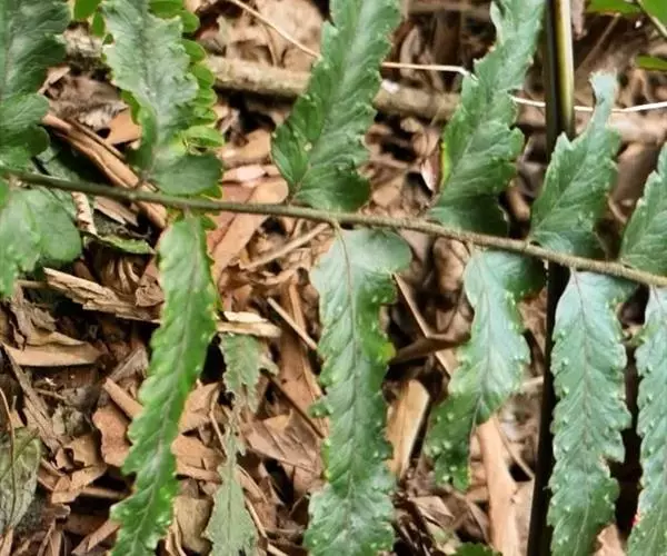 植株高约60厘米。根状茎长而横走,密被锈色长柔毛。叶远生;叶柄长20-30厘米,粗1.5-2毫米,深禾杆色,上面有纵沟,几光滑;叶片长圆三角形,先端渐尖,羽状深裂,基部不变狭,长与叶柄略等,宽13-25厘米,一回羽状;羽片20-25对,基部对生,远离,上部互生,接近,平展,有短柄,披斜形,近镰刀状,长10-15厘米,宽1-1.8厘米,先端渐尖,基部不等,上侧钝耳状,下侧楔形,边缘缺裂至浅裂,小裂片三角形,圆头或急尖,偏斜,全缘,或有少数齿牙,上部各羽片渐短,无柄。侧脉明显,在裂片上为羽状,2-3对,上先出,斜出,到达边缘以内。叶纸质,干后绿色,叶下面灰绿色,叶轴密被锈色开展的硬毛,在叶下面各脉及囊群盖上较稀疏,叶上面也多少有毛,少有光滑。孢子囊群圆形,每小裂片上1-6个,向边缘着生;囊群盖杯形,长宽几相等,上边截形,棕色,坚实,多少被短硬毛,距叶缘较远。