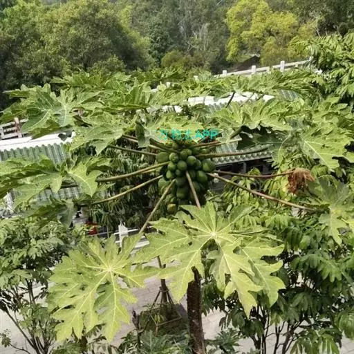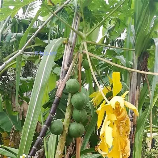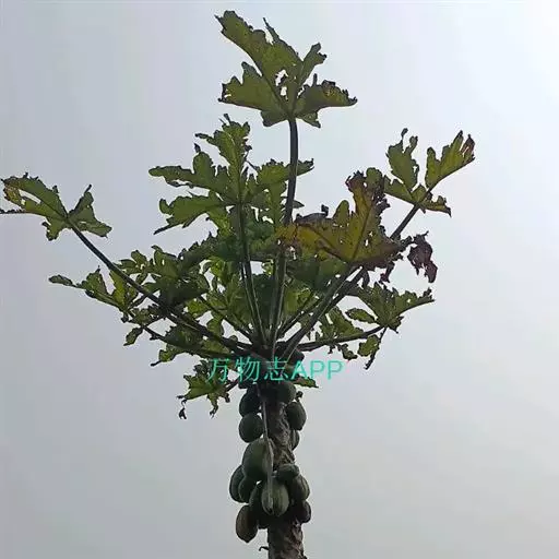 番木瓜(Carica papaya L.)又称木瓜、乳瓜、万寿果,为热带、亚热带常绿软木质小乔木,高达8-10米,具乳汁;茎不分枝或有时于损伤处分枝,具螺旋状排列的托叶痕。果实长于树上,外形像瓜,故名之木瓜。番木瓜的乳汁是制作松肉粉的主要成份。花果期全年。