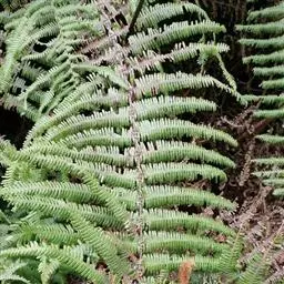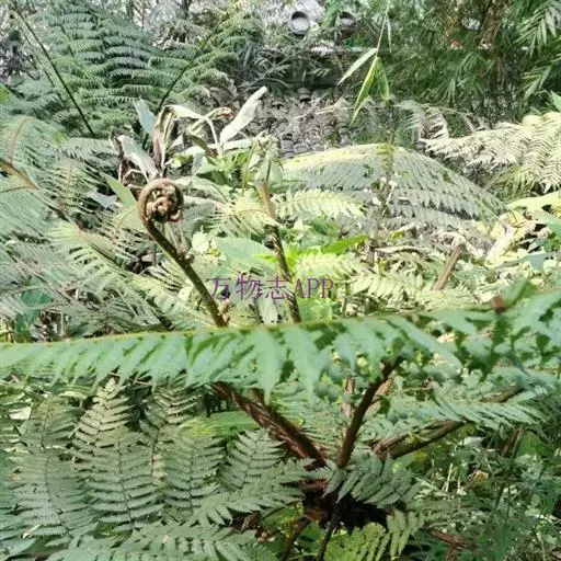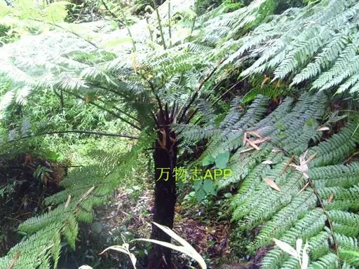 桫椤茎干高达6米或更高,直径10-20厘米,上部有残存的叶柄,向下密被交织的不定根。叶螺旋状排列于茎顶端;茎段端和拳卷叶以及叶柄的基部密被鳞片和糠秕状鳞毛,鳞片暗棕色,有光泽,狭披针形,先端呈褐棕色刚毛状,两侧有窄而色淡的啮齿状薄边;叶柄长30-50厘米,通常棕色或上面较淡,连同叶轴和羽轴有刺状突起,背面两侧各有一条不连续的皮孔线,向上延至叶轴。