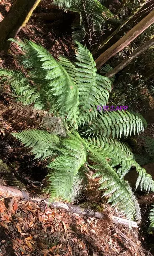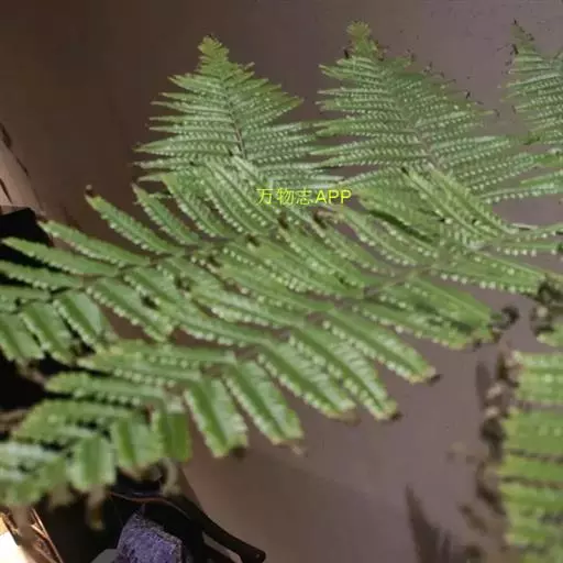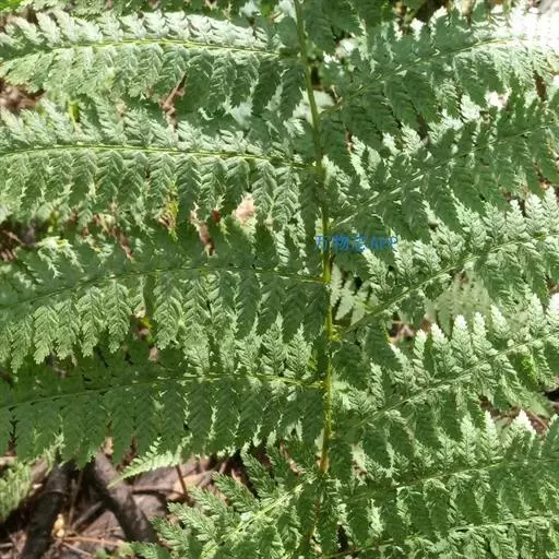 叶片大,长矩圆形,长1-2米,宽0.4-1.5米,三回羽状深裂;羽片17-20对,互生,基部一对缩短,长约30厘米,中部羽片长40-50厘米,宽14-18厘米,长矩圆形,二回羽状深裂;小羽片18-20对,基部小羽片稍缩短,中部的长9-12厘米,宽1.2-1.6厘米,披针形,先端渐尖而有长尾,基部宽楔形,无柄或有短柄,羽状深裂;裂片18-20对,斜展,基部裂片稍缩短,中部的长约7毫米,宽约4毫米,镰状披针形,短尖头,边缘有锯齿;叶脉在裂片上羽状分裂,基部下侧小脉出自中脉的基部;叶纸质,干后绿色;羽轴、小羽轴和中脉上面被糙硬毛,下面被灰白色小鳞片。