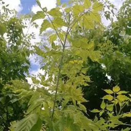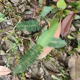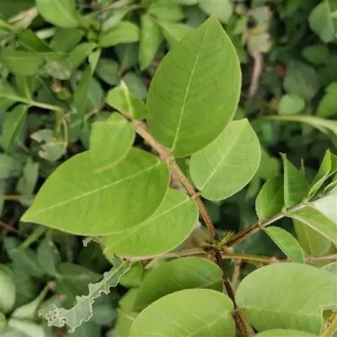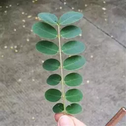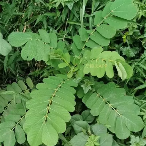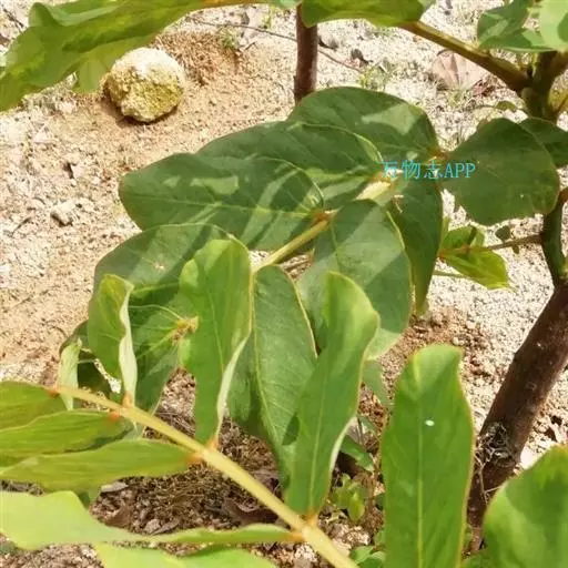 叶长30-60cm;在靠腹面的叶柄和叶轴上有二条纵棱条,有狭翅,托叶三角形;小叶6-12对,薄革质,倒卵状长圆形或长圆形,长8-15cm,宽3.5-7.5cm,顶端圆钝而有小短尖头,基部斜截形,下面叶脉明显凸起;小叶柄极短或近无柄。