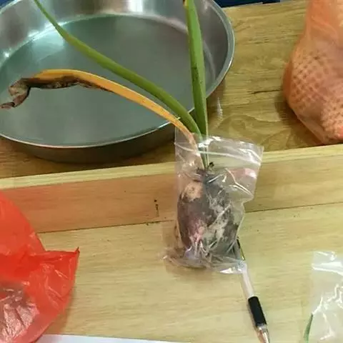1.将一棵娃娃菜洗净,放在盐水中浸泡半个小时,然后切成六瓣,皮蛋、香肠切丁备用,姜切片;