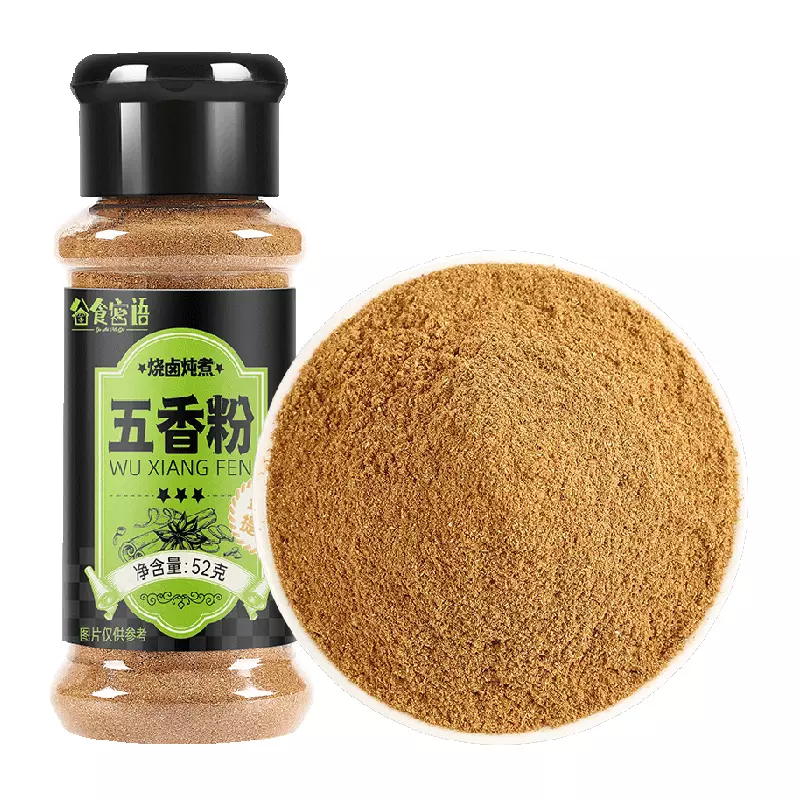 五香粉是将超过5种的香料研磨成粉状混合一起,常使用在煎、炸前涂抹在鸡、鸭肉类上,也可与细盐混合做沾料之用。广泛用于东方料理的辛辣口味的菜肴,尤其适合用于烘烤或快炒肉类、炖、焖、煨、蒸、煮菜肴作调味。其名称来自于中国文化对酸、甜、苦、辣、咸五味要求的平衡。