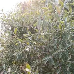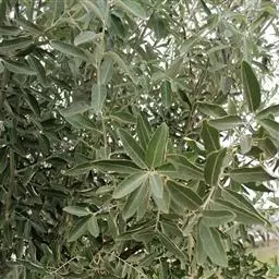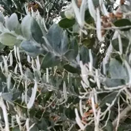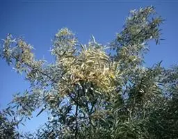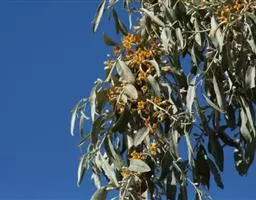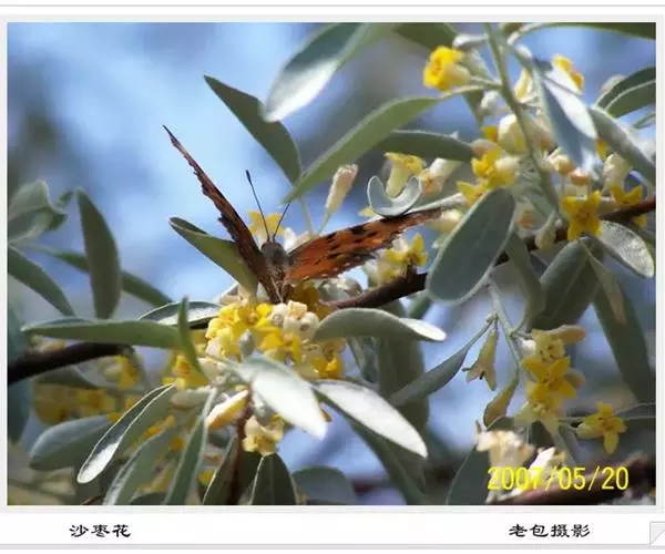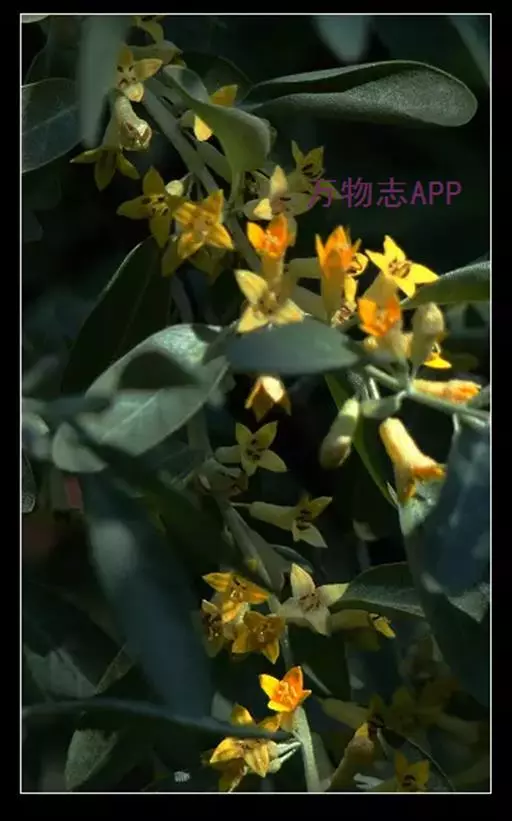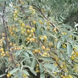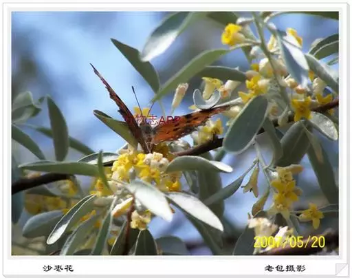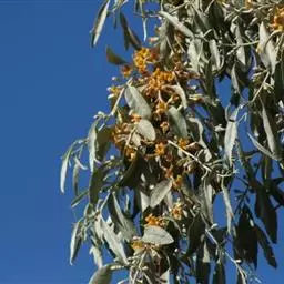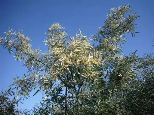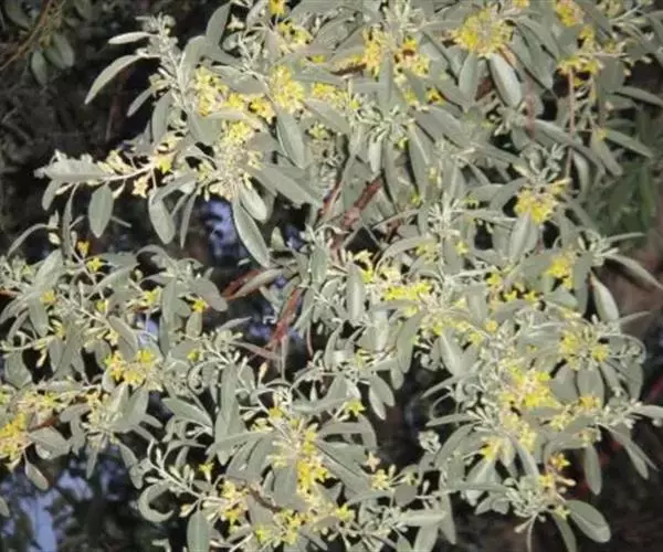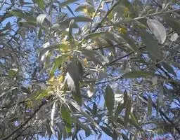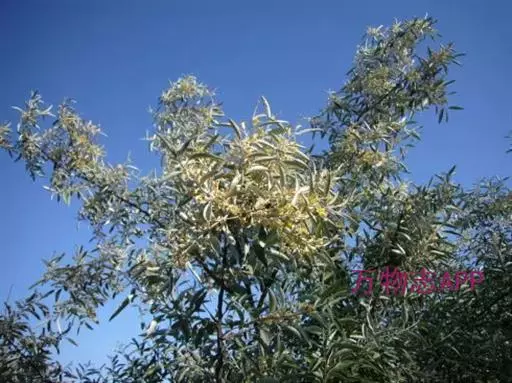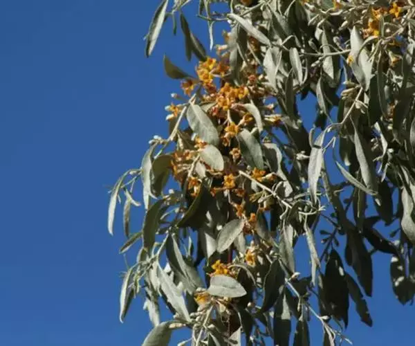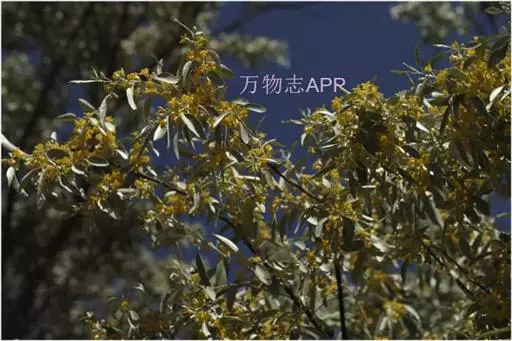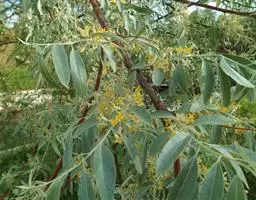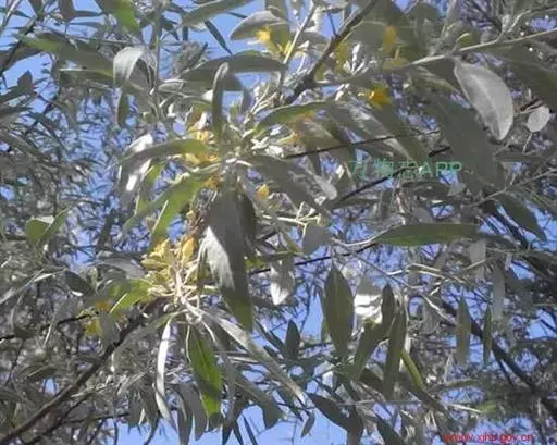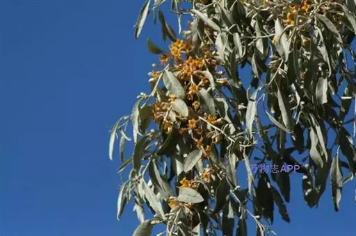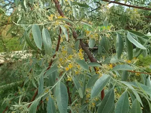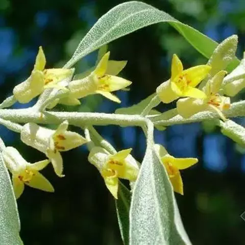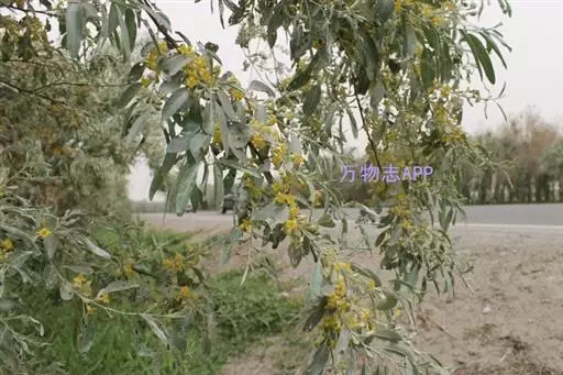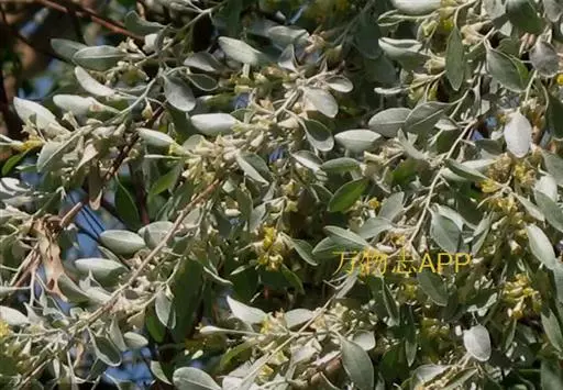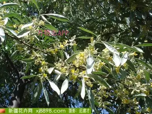沙枣又名银柳、银柳胡颓子、桂香柳、香柳。落叶灌木或小乔木,高5-10m。枝干受伤后流出透明褐色胶汁。常具亮棕红色硬利,幼枝密被银白色鳞片,老枝鳞片脱落,栗褐色,光滑;皮孔明显,点状横裂。单叶互生,薄纸质;叶柄长0.5-1cm;叶片椭圆状披针形或披针形,长2.5-8.5cm,宽0.5-2cm,先端尖,基部楔形,全缘,上面幼时被具银白色鳞片,后部分脱落,下面银白色,有光泽,密被白色鳞片;侧脉不明显。花1-3朵生于叶腋,两性,稀单性;花被筒呈钟状或漏斗状,先端4裂,外面银白色,里面黄色,有香味;花盘先端无毛;雄蕊几无花丝;花柱长于雄蕊,先端环状弯曲。果实椭圆形,长约1.5cm,粉红色,被银白色鳞片。花期5-6月,果期9月。