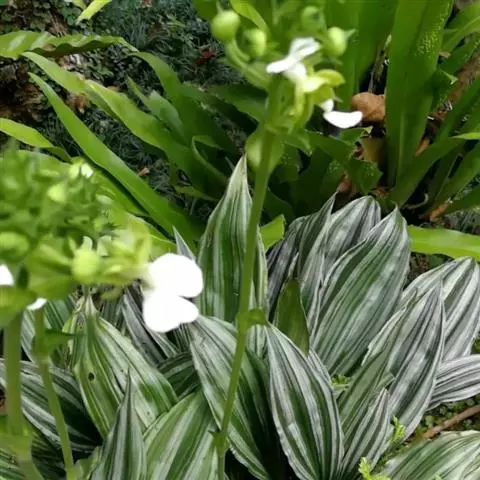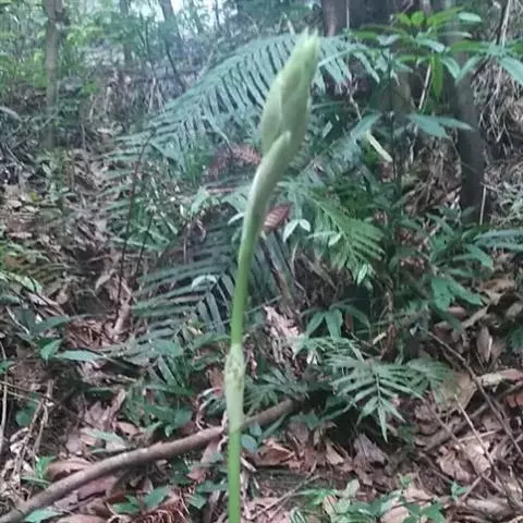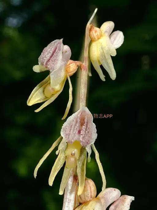 裂唇虎舌兰(学名:Epipogium aphyllum (F. W. Schmidt) Sw.):植株高10-30厘米,地下具分枝的、珊瑚状的根状茎。茎直立,淡褐色,肉质,无绿叶,具数枚膜质鞘;鞘抱茎。总状花序顶生,具2-6朵花;花黄色而带粉红色或淡紫色晕,多少下垂;萼片披针形或狭长圆状披针形,花瓣与萼片相似,常略宽于萼片;唇瓣近基部3裂。花期8-9月。