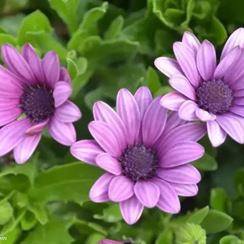 蓝目菊株高一般在60cm以下。基生叶丛生,茎生叶互生,长圆形至倒卵形,通常羽裂,全缘或少量锯齿,叶面幼嫩时有白色绒毛。花径7.5㎝左右,舌状花白色,先端尖 ,背面淡紫色,盘心蓝紫色。有单瓣、重瓣之分。花期夏秋季。