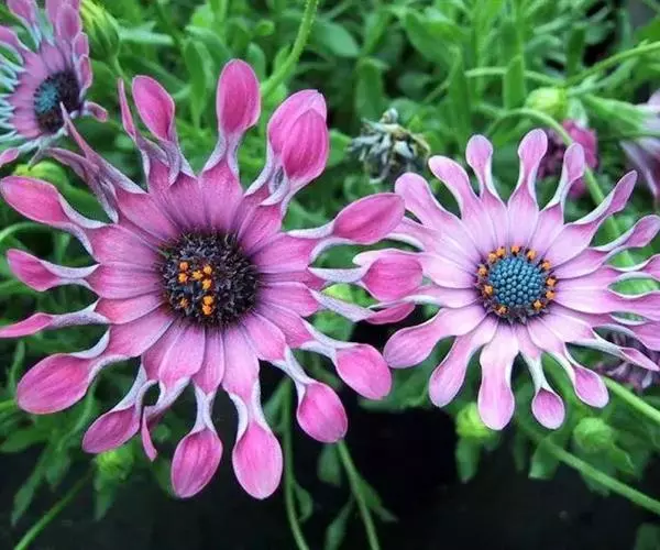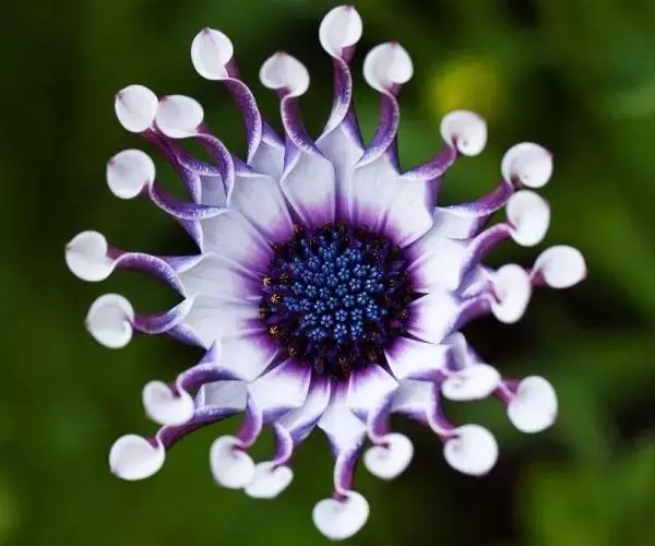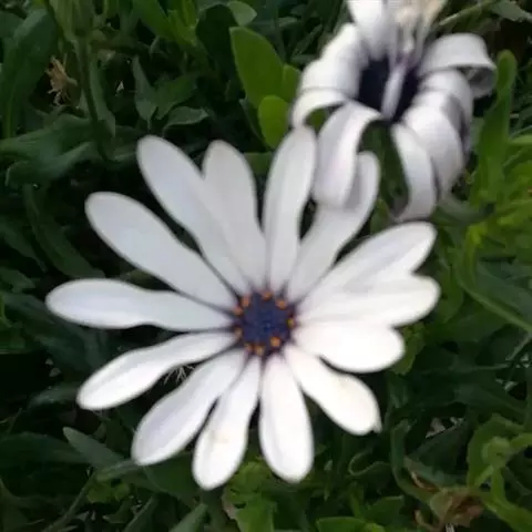 经常会和南非万寿菊混淆,区别是 1、蓝目菊的叶子通常羽状分裂,而南非万寿菊(蓝眼睛)一般不分裂。2、花朵 蓝目菊的花心,即所谓管状花部分,只有蓝色,南非万寿菊(蓝眼睛)有蓝色、黄色及紫色,一般说来,在蓝目菊属中,耐寒性的种类则会在中央呈深蓝色;缘花部分(舌状花),蓝目菊只有白色一种,而南非万寿菊(蓝眼睛)多呈紫、粉、白、黄等色。