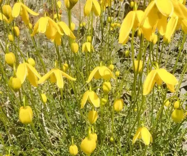 花单生,有时为单聚伞花序,有3花,腋生;花序梗粗壮,长(4.5-)6-15(-20)厘米,有柔毛;萼片4,黄色外面带紫色,斜上展,狭卵形、椭圆状长圆形,长1.5-2.5(-3.5)厘米,顶端渐尖或急尖,外面边缘有短绒毛,中间被柔毛,内面无毛,或近无毛;花丝下面稍扁平,被开展的柔毛,花药无毛; 子房密生柔毛。