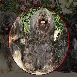 头部:沉重的头部饰毛,垂落在眼睛前,有大量胡须和髭须;脑袋窄,在眼睛后面明显凹陷,不很平坦,但也不拱起或呈苹果状。笔直的前脸有足够的长度。鼻镜为黑色,从鼻镜到眼睛的距离大约为从鼻镜到后脑距离的1/3。