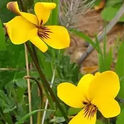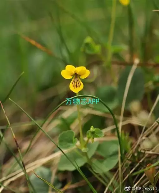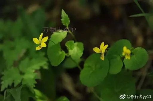 双花堇菜又名:孪生堇菜,短距黄花堇菜。多年生草本。根状茎细或稍粗壮,垂直或斜生,具结节,有多数细根。地上茎较细弱,高10-25厘米,2或数条簇生,直立或斜升,具3(-5)节,通常无毛或幼茎上被疏柔毛。基生叶2至数枚,具长4-8厘米的长柄,叶片肾形、宽卵形或近圆形,长1-3厘米,宽1-4.5厘米,先端钝圆,基部深心形或心形,边缘具钝齿,上面散生短毛,下面无毛,有时两面被柔毛;茎生叶具短柄,叶柄无毛至被短毛,叶片较小;托叶与叶柄离生,卵形或卵状披针形,长3-6毫米,先端尖,全缘或疏生细齿。花黄色或淡黄色,在开花末期有时变淡白色;花梗细弱,长1-6厘米,上部有2枚披针形小苞片;萼片线状披针形或披针形,长3-4毫米,先端急尖,基部附属物极短,具膜质缘,无毛或中下部具短缘毛;花瓣长圆状倒卵形,长6-8毫米,具紫色脉纹,侧方花瓣里面无须毛,下方花瓣连距长约1厘米;距短筒状,长2-2.5毫米;下方雄蕊之距呈短角状;子房无毛,花柱棍棒状,基部微膝曲,上半部2深裂,裂片斜展,其间具明显的柱头孔。蒴果长圆状卵形,长4-7毫米,无毛。花果期5-9月。