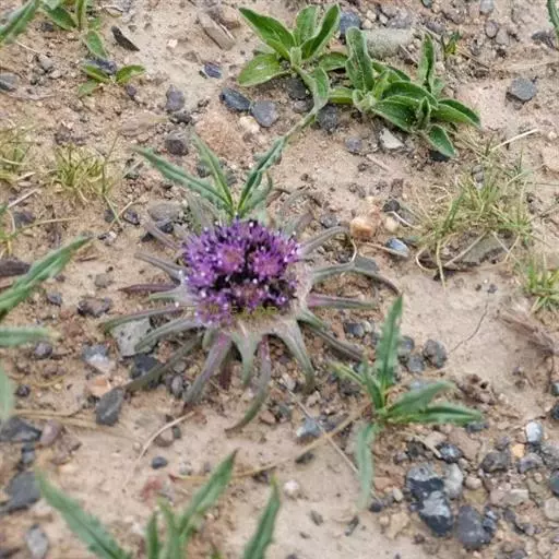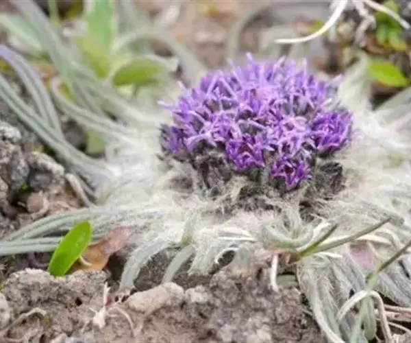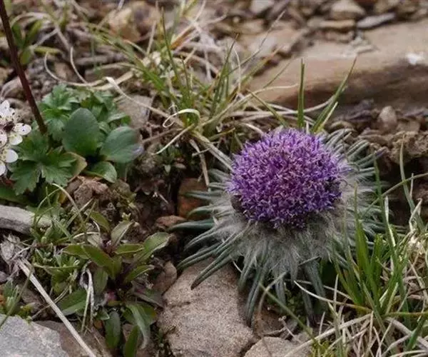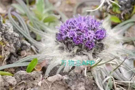 头状花序无小花梗或有长近2毫米的小花梗,多数在莲座状叶丛中密集成半球形的直径为4厘米的总花序。总苞圆柱状,直径6毫米;总苞片5层,外层长椭圆形或长圆形,长7毫米,宽4毫米,顶端急尖,紫红色,外面密被白色长柔毛,中层长圆形,长1.2厘米,宽2.5毫米,顶端圆形,内层长披针形,长9毫米,宽2毫米,顶端渐尖,外面无毛。小花紫红色,长1厘米,细管部与檐部各长5毫米。