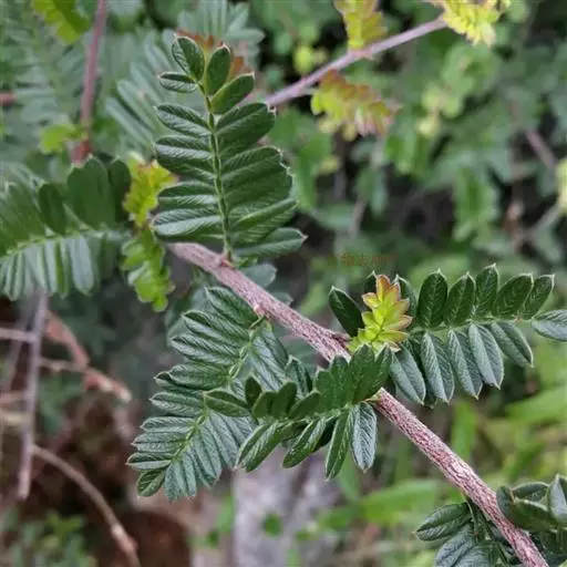 落叶或半常绿灌木,高1-3m。小枝细弱微弯,红褐色或紫褐色,幼时密被灰白色柔毛,后渐脱落,多年生枝黑褐色。奇数羽状复叶,互生,具小叶片7-15 对,连叶柄长2-4.5cm,幼时被绒毛;托叶披针形,有柔毛,早落;小叶片对生,椭圆形、椭圆状长圆形或倒卵状长圆形,长5-10mm,宽2-4mm, 先端急尖或突尖,基部宽楔形或近圆形,全缘,两面均疏被柔毛,下面较密,小叶柄极短;叶轴上有窄叶翼。花两性;顶生伞房花序,有花3-5朵,直径 2-3cm;总花梗和花梗均密被灰白色柔毛;苞片线状披针形,早落;萼筒钟状;萼片5,与萼筒近等长,外面有柔毛;花瓣5,长圆形,白色;雄蕊20;花柱5,基部被长柔毛,柱头头状。梨果卵形或近球形,直径6-8mm,蓝黑色,萼片宿存反折;小核5,骨质,表面粗糙。花期4-5月,果期7月。