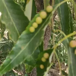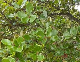 常绿乔木,单叶互生,椭圆倒卵形,全缘或刺状,略外卷;表面有光泽,新叶黄绿渐转略带红色,老叶暗绿,背面无毛,灰绿。嫩枝树皮由黄绿转暗红,老枝灰白,当年枝较纤细,柔韧性佳,老枝坚韧硬度强;树型高大,高达20米以上,冠幅40米以上,独特、优美的延展性拱形树冠,可形成一个宽大圆形的遮蓬,树龄可达300年以上。