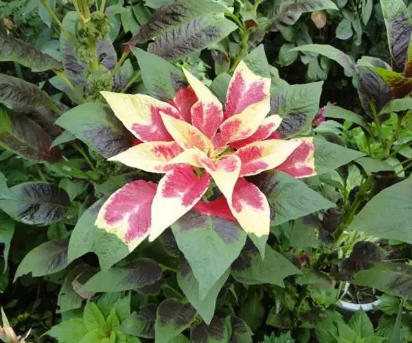 一年生草木,株高60-100cm,茎直立,粗壮,绿色或红色,分枝少,单叶互生,卵形或菱状卵形,有长柄。初秋时上部叶片变色,普通品种变为红、黄、绿三色相间,优良品种则呈鲜黄或鲜红色,艳丽,顶生叶尤为鲜红耀眼,观赏期6-10月,其中8-10月为最佳观赏期。花小,单性或杂性,簇生叶腋或呈顶生穗状花序,花序小而不明显,单性花或两性花,雌雄同株,花期7~9月 。浆果卵形,成熟期9-10月;种子细小,亮黑色。