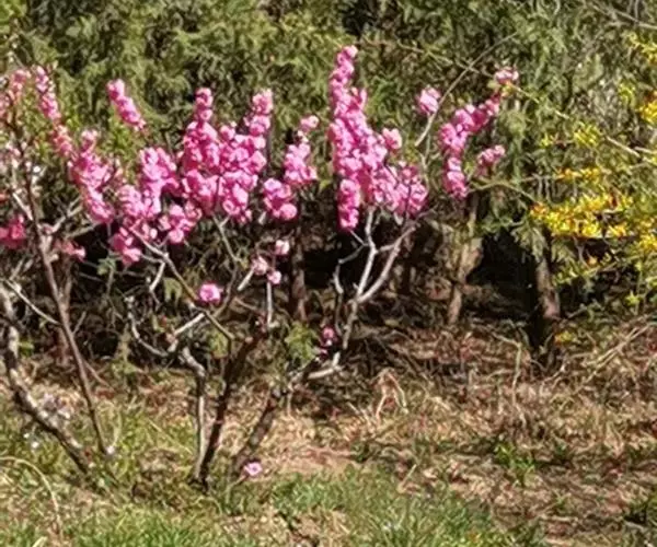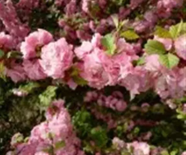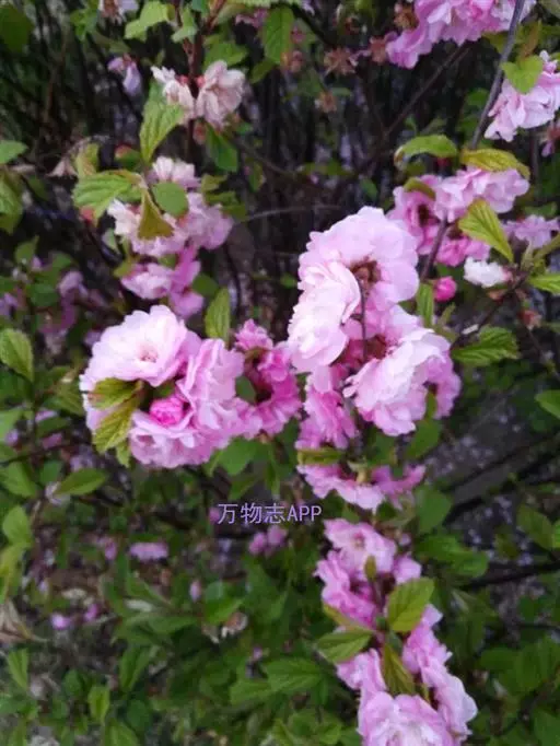 (3)半重瓣榆叶梅:粉红色花朵,半重瓣,花菩、花辨均在10片以上。植株的小枝呈红褐色,园林、庭院中栽培比较广泛。