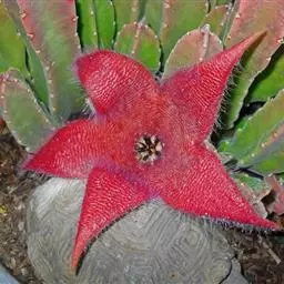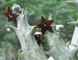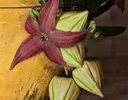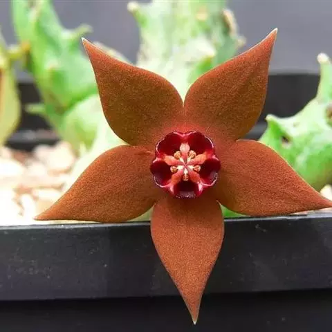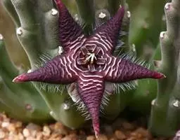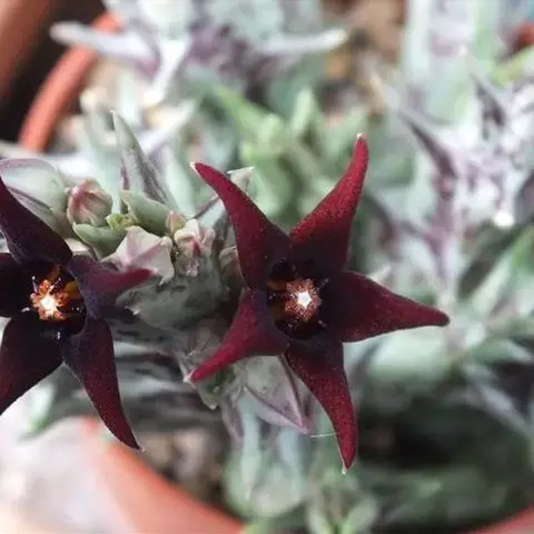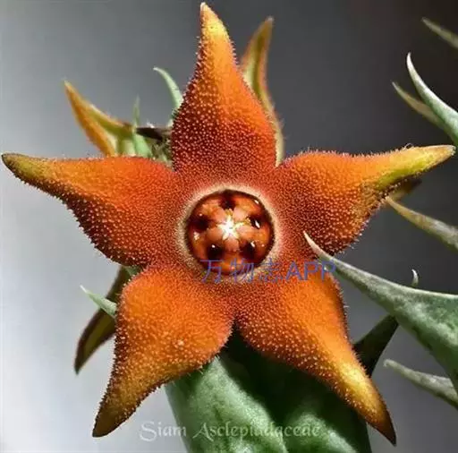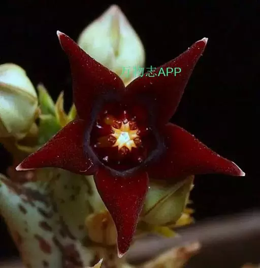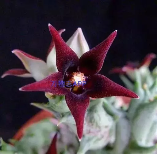 紫龙角,多年生肉质草本,植株灰绿色,表面长有紫褐色斑纹,棱缘波 状,有齿状突起。看起来好像很硬,但摸起来却软软的。植株低矮,分枝多,开深褐红色星状的花,花星状,深褐红色,被白色浓毛,花有臭味,会吸引苍蝇。