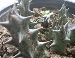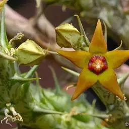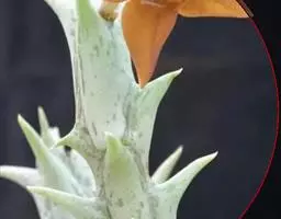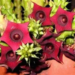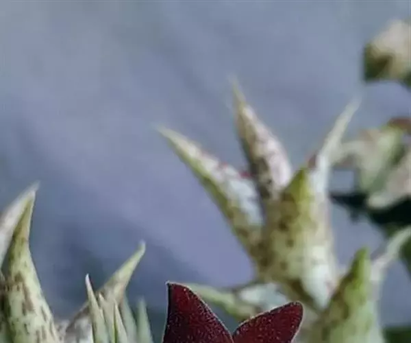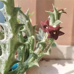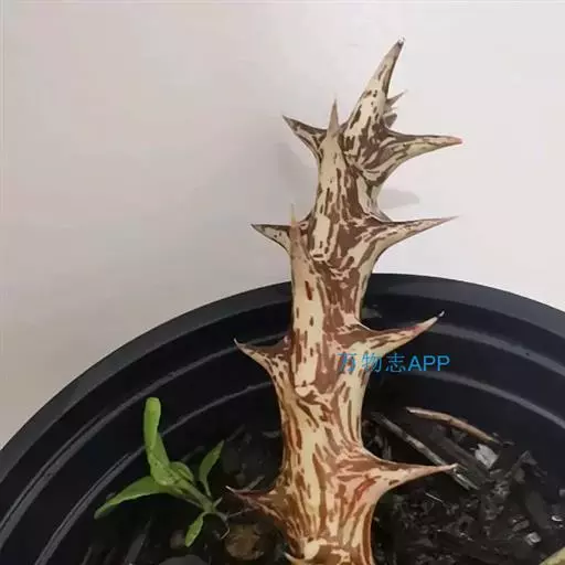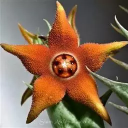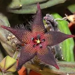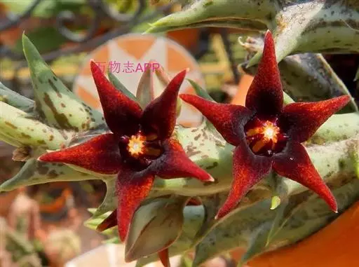 紫龙角(Caralluma hesperidum)萝藦科水牛掌属(水牛角属),分布于北非、地中海地区和南也门的索科特拉岛,又名水牛角。开出的花很招苍蝇。多年生肉质草本,植株灰绿色,表面长有紫褐色斑纹。看起来好像很硬,但摸起来却软软的。植株低矮,分枝多,开深褐红色星状的花,花有臭味,会吸引苍蝇,所以很少有人在养。