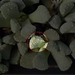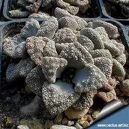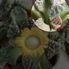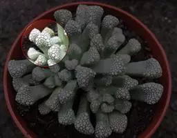 雷童为多年生肉质草本植物,呈分枝密集的灌木状,高 雷童开花 约30厘米,二歧分枝,老枝灰褐色或浅褐色,新枝淡绿色,上有白色小突起。肉质叶卵圆半球形,长1~1.3厘米,厚0.6~0.7厘米,基部合生,暗绿色,表皮具白色半透明的肉质刺,老叶的肉质刺常脱落,留下圆形疵状疤痕。花单生,具短梗,花很小,径仅1.2一1.5厘米,花白色或淡黄色。