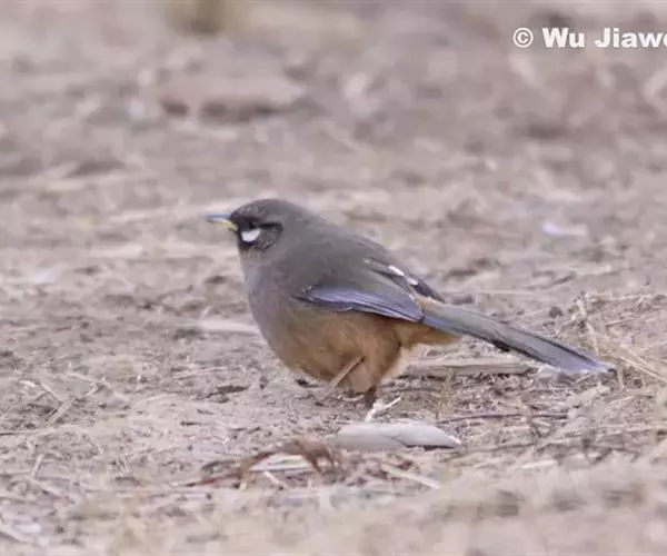 中等体型(28厘米)的酒灰褐色噪鹛。脸颊及耳羽明显为白色,上下各有黑褐色条纹与烟褐色的眼先相接。外侧尾羽混灰色而端白。三级飞羽羽端白。尾上覆羽棕色,臀暖皮黄色。