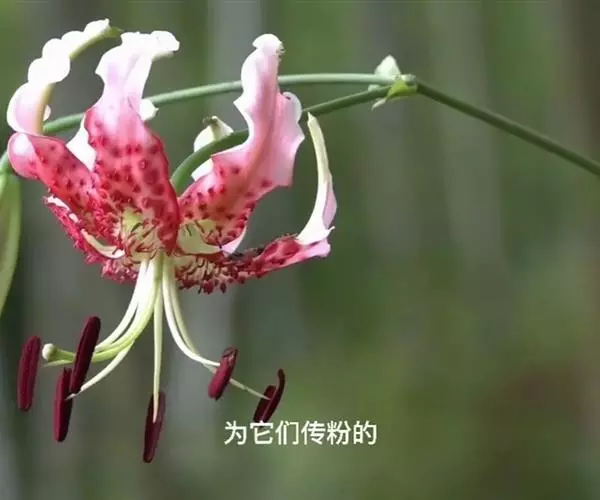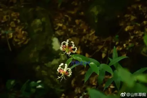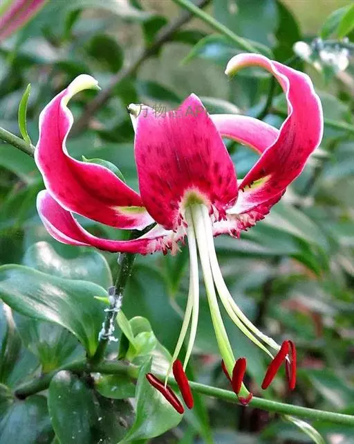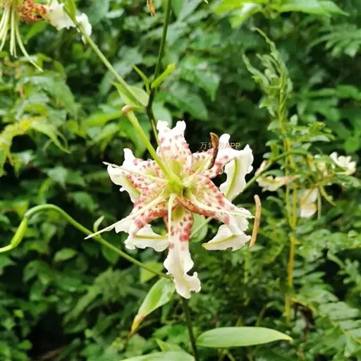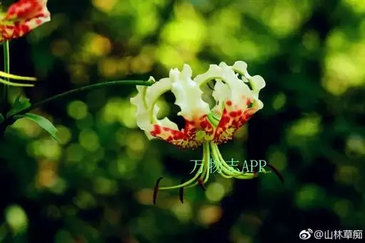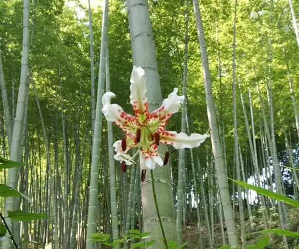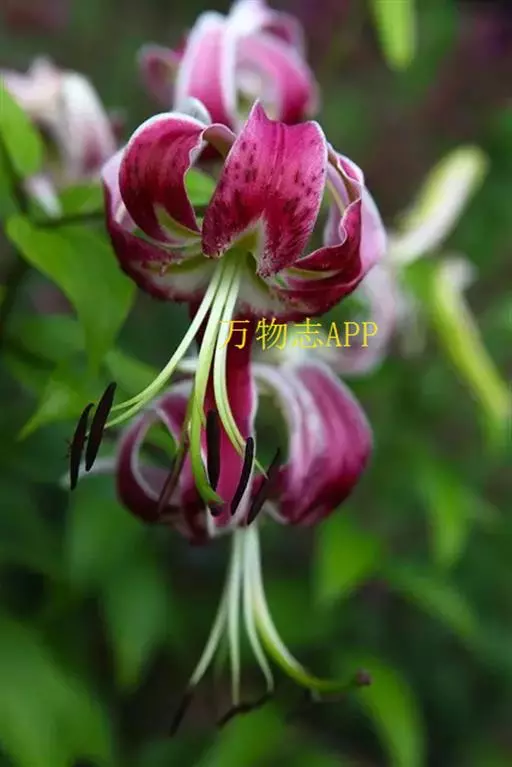鳞片宽披针形,长2厘米,宽1.2厘米,白色。茎高60-120厘米,无毛。叶散生,宽披针形、矩圆状披针形或卵状披针形,长2.5-10厘米,宽2.5-4厘米,先端渐尖,基部渐狭或近圆形,具3-5脉,两面无毛,边缘具小乳头状突起,有短柄,柄长约5毫米。花1-5朵,排列成总状花序或近伞形花序;苞片叶状,卵形,长3.5-4厘米,宽2-2.5厘米;花梗长达11厘米;花下垂,花被片长6-7.5厘米,反卷,边缘波状,白色,下部1/2-1/3有紫红色斑块和斑点,蜜腺两边有红色的流苏状突起和乳头状突起;雄蕊四面张开;花丝长5.5-6厘米,绿色,无毛,花药长1.5-1.8厘米,绛红色;子房圆柱形,长约1.5厘米;花柱长为子房的2倍,柱头膨大,稍3裂。蒴果近球形,宽3厘米,淡褐色,成熟时果梗膨大。花期7-8月,果期10月。