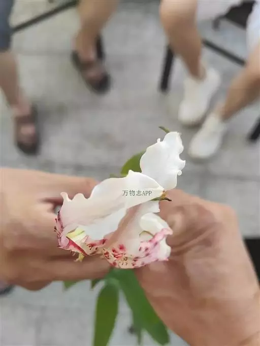 有5条脉,具短柄。花通常1—5朵,成总状花序,下垂,花不为喇叭状或钟状,也无花被管,花被片6,长约10厘米,宽2厘米,纯白色,反卷,边缘成波状,1/3—1/2外有红色斑块和斑点,蜜腺两边具红色流苏状突起,雄蕊上端常向外张开,花丝绿色,无毛,苞片长1.5厘米,绛红色,子房圆柱形,长1.5厘米,花柱长为子房的2倍,柱头微裂。蒴果近球形,直径约3厘米,成熟时果梗膨大。