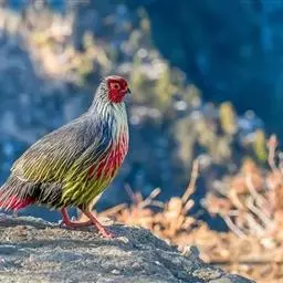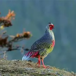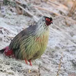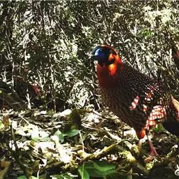 血雉雉科血雉属鸟类,别名血鸡、松花鸡,血雉的雄鸟大覆羽、尾下覆羽、尾上覆羽、脚、头侧、腊膜为红色,…