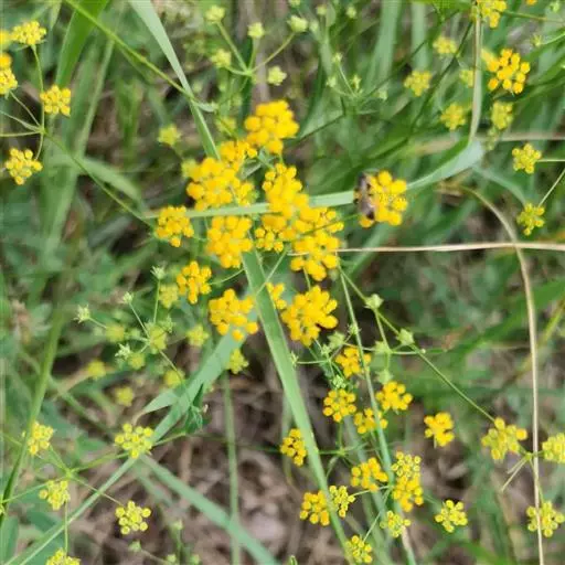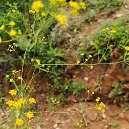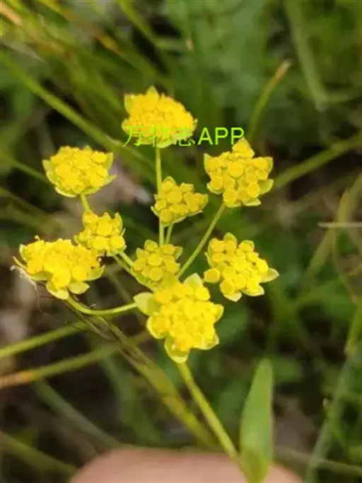 复伞形花序很多,花序梗细,常水平伸出,形成疏松的圆锥状;总苞片2-3,或无,甚小,狭披针形,长1-5毫米,宽0.5-1毫米,3脉,很少1或5脉;伞辐3-8,纤细,不等长,长1-3厘米;小总苞片5,披针形,长3-3.5毫米,宽0.6-1毫米,顶端尖锐,3脉,向叶背凸出;小伞直径4-6毫米,花5-10;花柄长1毫米;花直径1.2-1.8毫米;花瓣鲜黄色,上部向内折,中肋隆起,小舌片矩圆形,顶端2浅裂;花柱基深黄色,宽于子房。