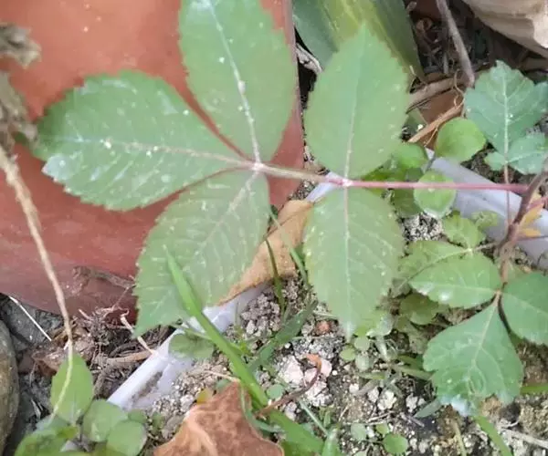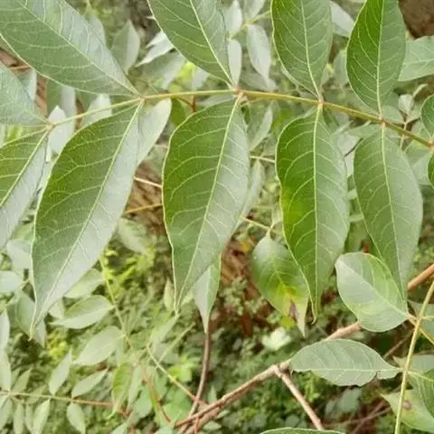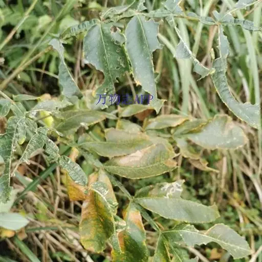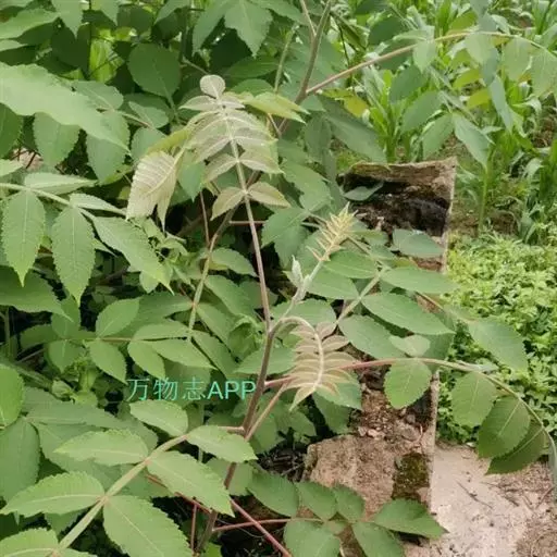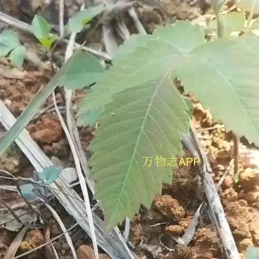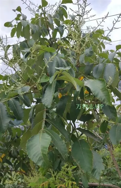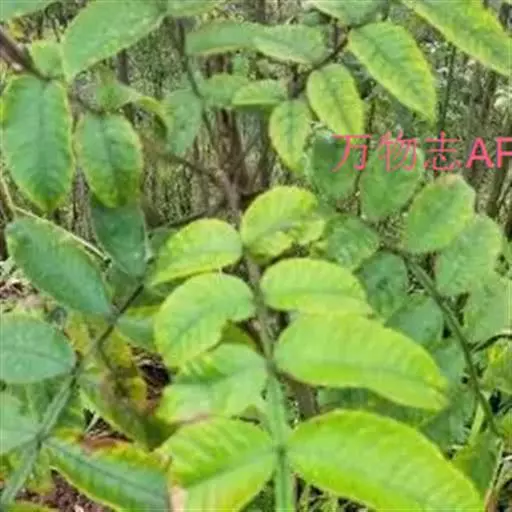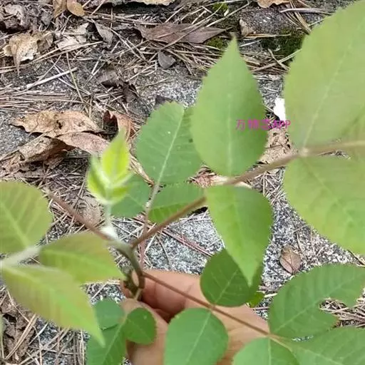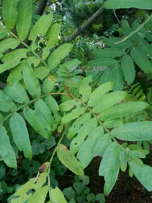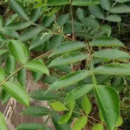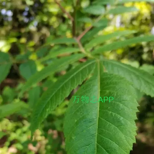 奇数羽状复叶有小叶(2-)3-6对,纸质,边缘具粗钝锯齿,背面密被灰褐色毛,叶轴具宽的叶状翅,小叶自下而上逐渐增大,叶轴和叶柄密被锈色柔毛;小叶多形,卵形或椭圆状卵形或长圆形,长6-12厘米,宽3-7厘米,先端急尖,基部圆形,顶生小叶基部楔形,边缘具粗锯齿或圆齿,叶面暗绿色,叶背粉绿色,被白粉,叶面沿中脉疏被柔毛或近无毛,叶背被锈色柔毛,脉上较密,侧脉和细脉在叶面凹陷,在叶背突起;小叶无柄。