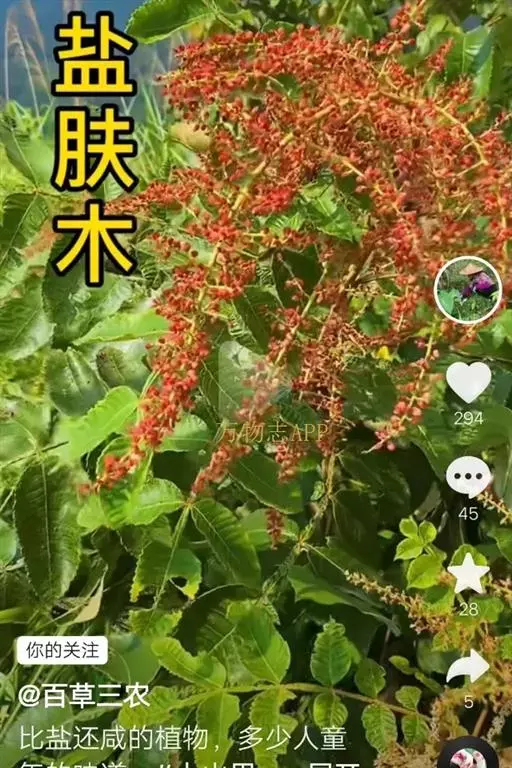 【佤药】盐肤木:根、叶治疗湿热黄疸,膀胱炎,咽喉炎,肠炎,痢疾,咯血,疮疡痈毒,胃腹痛,感冒,痘疹不透《中佤药》。