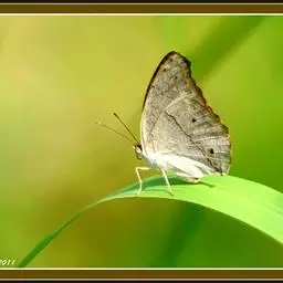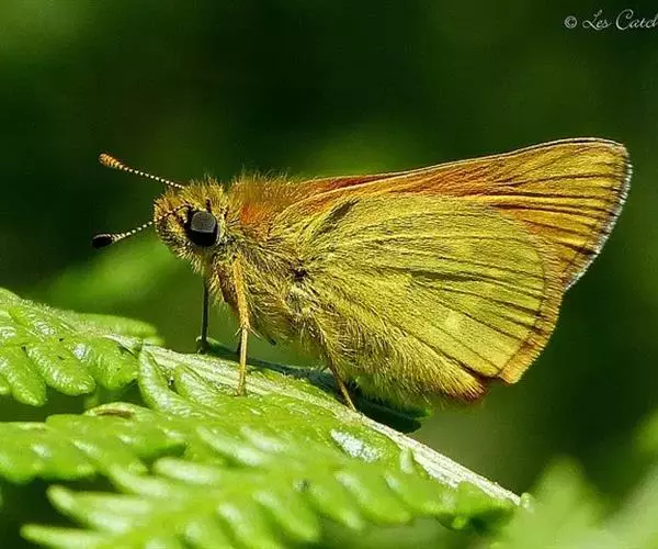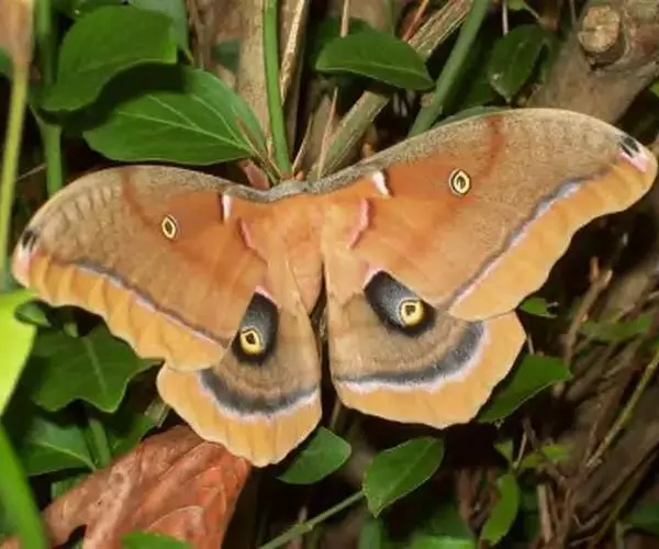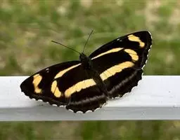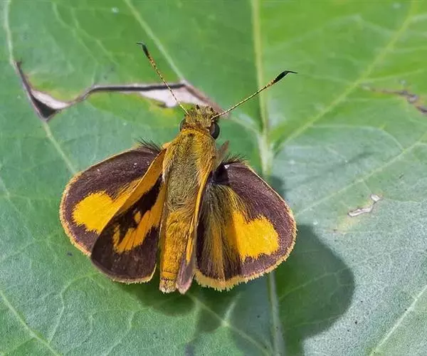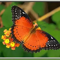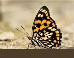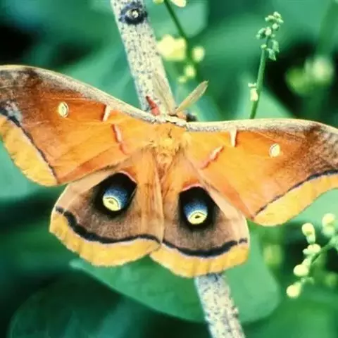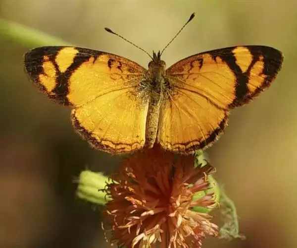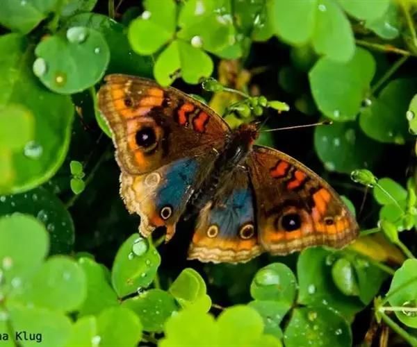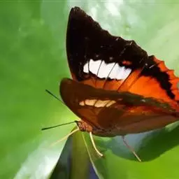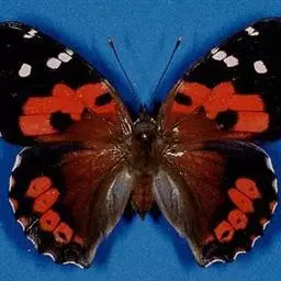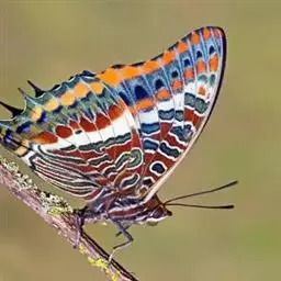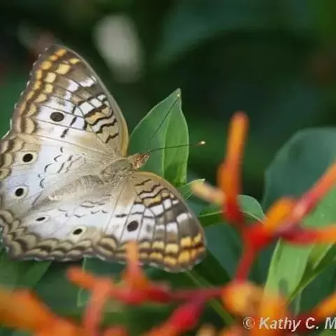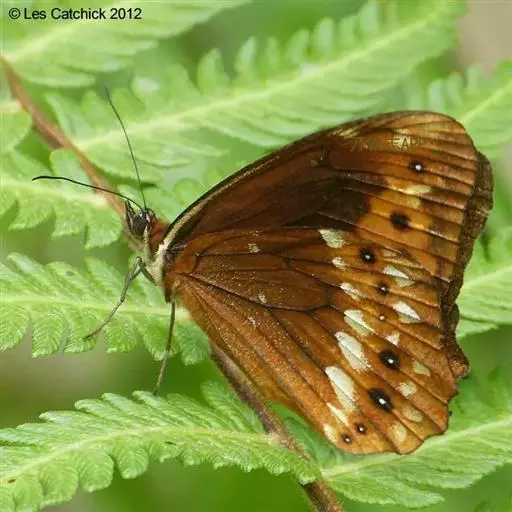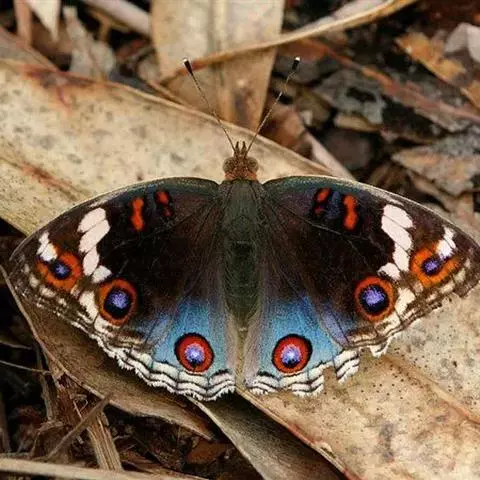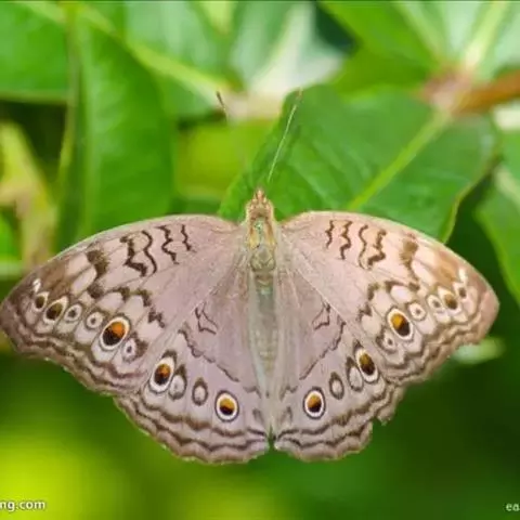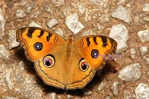 美眼蛱蝶Junonia almana(linnaeus),雄蝶翅展54mm,52mm。翅橙红色,前后翅外缘各有3条黑褐色波状线,翅面各有2个眼斑,前翅眼斑上小下大,后翅眼斑上大下小。前翅前缘褐色,有4个肾形斑,其中基部肾形斑中空,端部1肾形斑与小眼斑相连。该种分夏型和秋型:夏型翅缘较整齐,反面眼斑明显;秋型翅缘有突起,反面呈枯叶状 。幼虫黑褐色,密生枝刺。