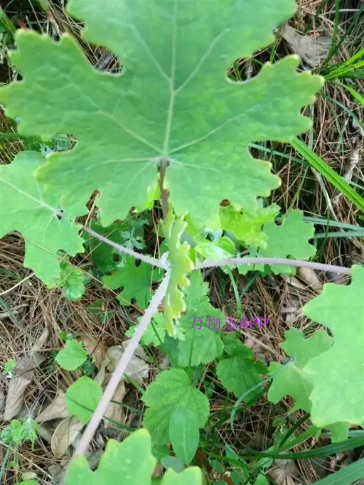 叶片宽卵形或近圆形,长5-27厘米,宽5-25厘米,先端急尖、渐尖、钝或圆形,通常7或9深裂或浅裂,裂片半圆形、方形、兰角形或其他,边缘波状、缺刻状、粗齿或多细齿,表面绿色,无毛,背面多白粉,被易脱落的细绒毛,基出脉通常5,侧脉2对,稀3对,细脉网状,常呈淡红色;叶柄长1-12厘米,上面具浅沟槽。