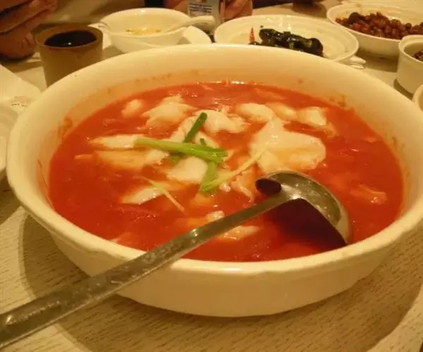 5、汤炖到比较浓的时候,倒掉泡着的鱼片的黄酒和水分,将鱼片倒到番茄汤里,大火煮一小会儿,大部分鱼片变色后,开小火煮3、5分钟,不能煮太过,以免鱼片煮老。